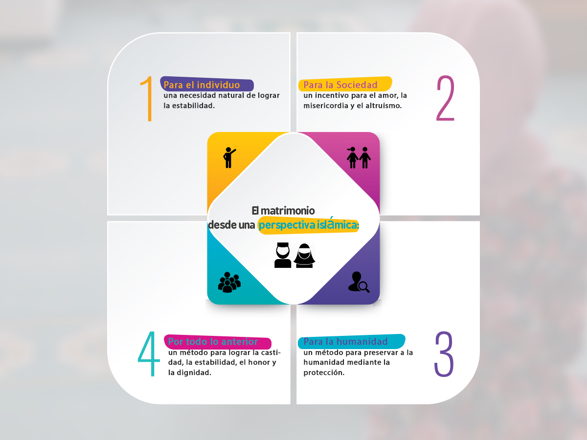 El matrimonio desde una perspectiva islámica: - Para el individuo: una necesidad natural de lograr la estabilidad. - Para la Sociedad: un incentivo para el amor, la misericordia y el altruismo. - Para la humanidad: un método para preservar a la humanidad mediante la protección. - Por todo lo anterior: un método para lograr la castidad, la estabilidad, el honor y la dignidad.