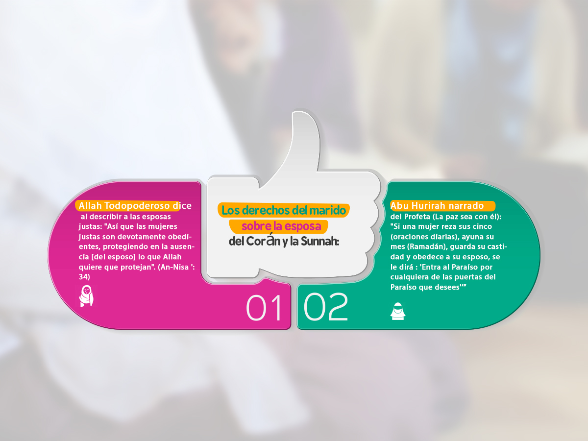 Los derechos del marido sobre la esposa del Corán y la Sunnah: Allah Todopoderoso dice al describir a las esposas justas: "Así que las mujeres justas son devotamente obedientes, protegiendo en la ausencia [del esposo] lo que Allah quiere que protejan". (An-Nisa ': 34) _Abu Hurirah narrado del Profeta (La paz sea con él): "Si una mujer reza sus cinco (oraciones diarias), ayuna su mes (Ramadán), guarda su castidad y obedece a su esposo, se le dirá : 'Entra al Paraíso por cualquiera de las puertas del Paraíso que desees' ".
