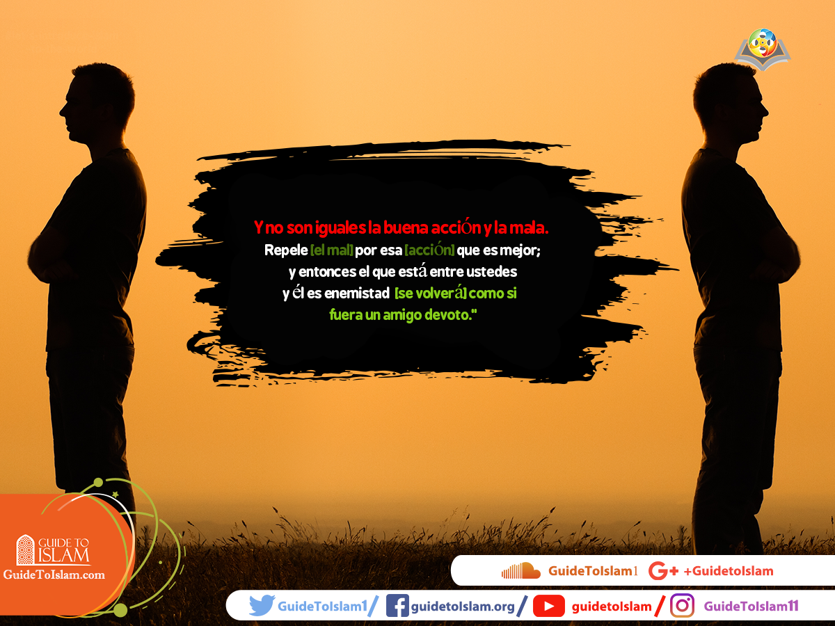 Y no son iguales la buena acción y la mala. Repele [el mal] con esa [acción] que es mejor, y entonces el que está entre ustedes y él es enemistad [se volverá] como si fuera un amigo devoto. Esta es una receta divina para tratar con los seres humanos que nos son enviados desde arriba de los siete cielos; usa misericordia y clemencia para ganar amistad y cercanía. Este es el mensaje del Sagrado Corán.