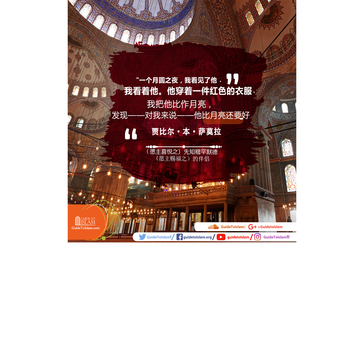“一个月圆之夜,我看见了他。我看着他。他穿着一件红色的衣服。我把他比作月亮,发现——对我来说——他比月亮还要好。——贾比尔·本·萨莫拉(愿主喜悦之)先知穆罕默德(愿主赐福之)的伴侣。